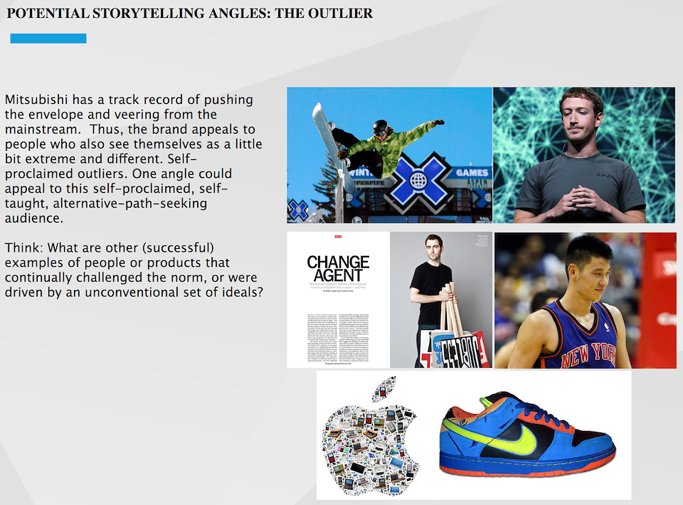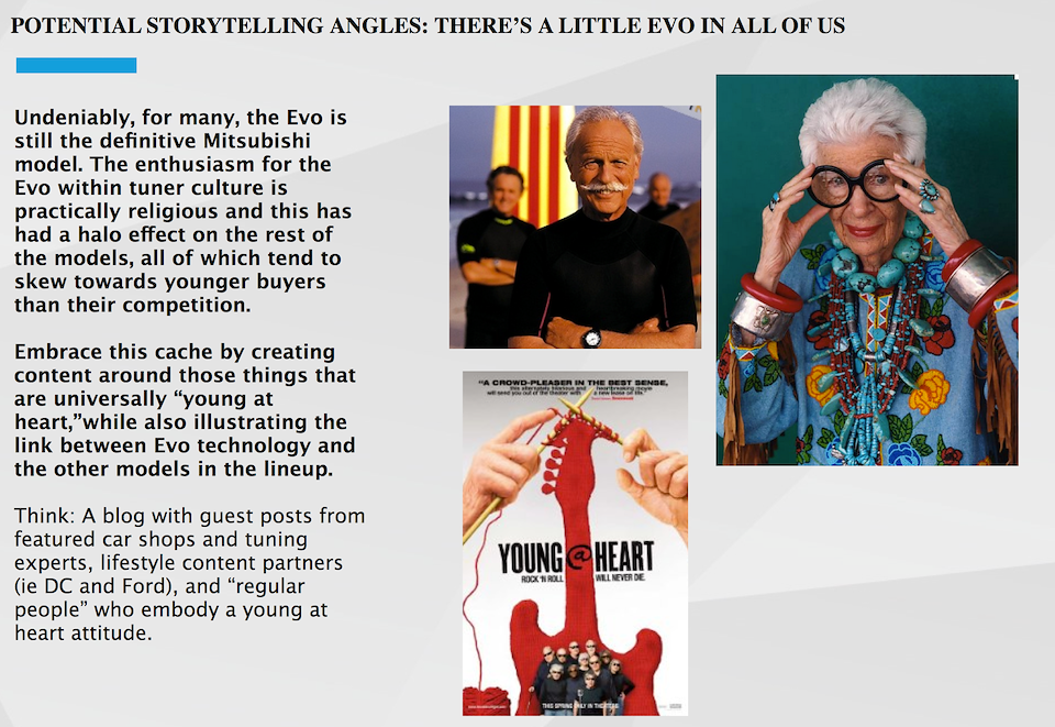 Mitsubishi was evolving as a brand, much to the dismay of many loyal Evo fans. I was building a social media practice and was given the opportunity to present potential content marketing angles based on in-depth knowledge of the brand and the target.